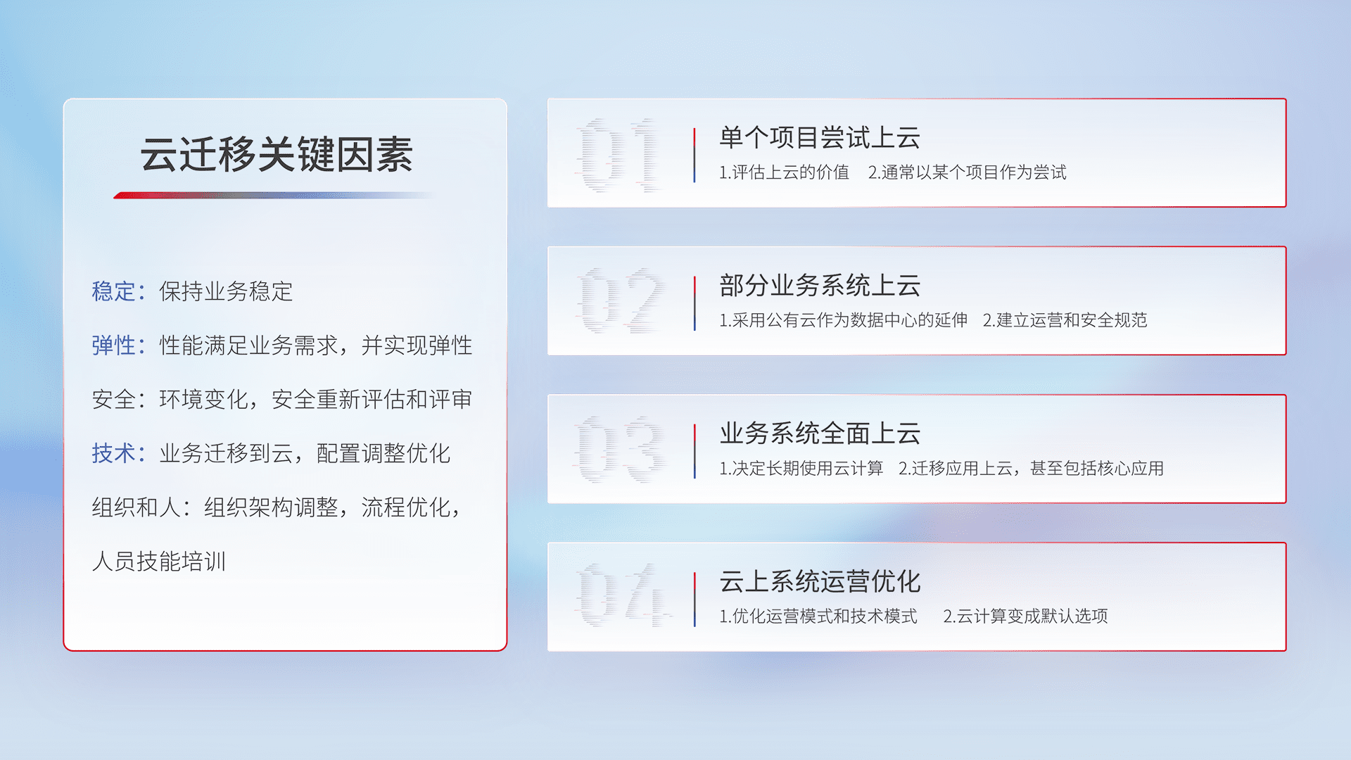 结合实际业务,,从规划设计、、、、云平台选型、、、云原生改造、、数据迁移、、、、集成交付,,,迁移全过程为客户识别最佳上云路径,,,,做好风险识别管理,,,,设计网络架构、、、、身份权限、、、安全审计合规、、、、操作审计、、日志审计、、、监控告警策略、、、、多站点容灾设计等,,,对云上基础设施进行整体规划,,,,提升IT治理水平,,,,以满足弹性、、、高可用、、、高性能的需求。。。。