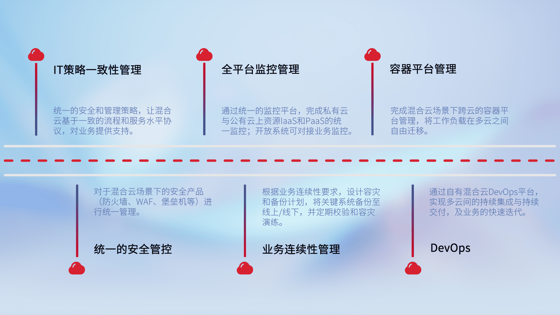 通过多云纳管,,以统一的资源数据模型把客户的云资源进行抽象和封装,,,,进而实现对多云资源的统一操作,,保障云资源管理的可靠性、、稳定性与可用性。。。量身定制化运维内容,,,,配置、、开发运维、、、补丁管理、、备份、、监控、、认证和访问管理、、、、审计和日常巡检等,,,保障在用云过程中的可靠度,,稳定度以及高可用率。。